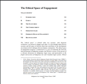 L’« espace éthique » se forme lorsque deux sociétés, aux visions du monde disparates, sont prêtes à s’engager mutuellement. La réflexion sur les sociétés diverses et l’espace qui les sépare permet de contribuer à l’élaboration d’un cadre pour le dialogue entre les communautés humaines. L’espace éthique d’engagement propose un cadre permettant d’examiner la diversité et le positionnement des peuples autochtones et de la société occidentale dans la poursuite d’une discussion pertinente sur les questions juridiques autochtones et notamment l’intersection fragile entre le droit autochtone et les systèmes juridiques canadiens.