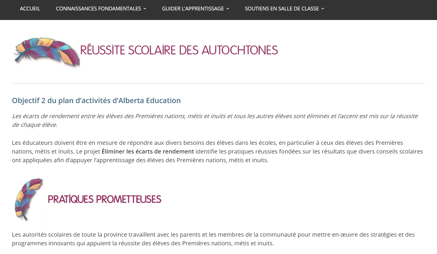 Ce site Web identifie et explore les pratiques efficaces fondées sur les résultats que divers conseils scolaires ont mis en pratique afin d’appuyer l’apprentissage des élèves des Premières nations, métis et inuits, y compris des guides d’apprentissage et des vidéos illustrant leurs expériences. La page comprend également une présentation qui raconte l’histoire de l’éducation des Premières nations, des Métis et des Inuits en Alberta jusqu’à aujourd’hui, en mettant notamment l’accent sur les pratiques prometteuses à travers la province, ainsi que sur les ressources et les outils accessibles à tous.
